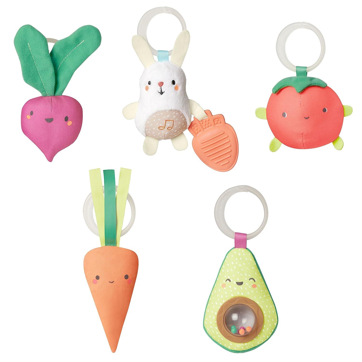 Fun and Educational Hanging Toys: Five engaging hanging toys include a rattle, squeaker, carrot with tactile ribbons, and a musical bunny with a carrot teether toy. These toys promote fine motor skills, auditory development, and tactile exploration
